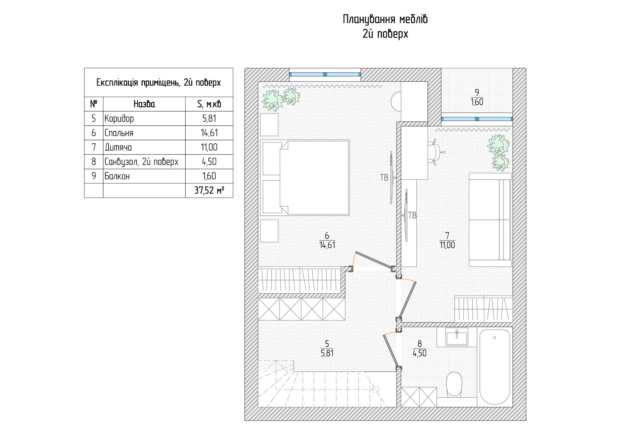 Мають два поверхи: велику кухню вітальню, гардеробну кімнату та санвузол на 1-му поверсі, дві окремих спальні кімнати та двругий санвузол на другому поверсі.